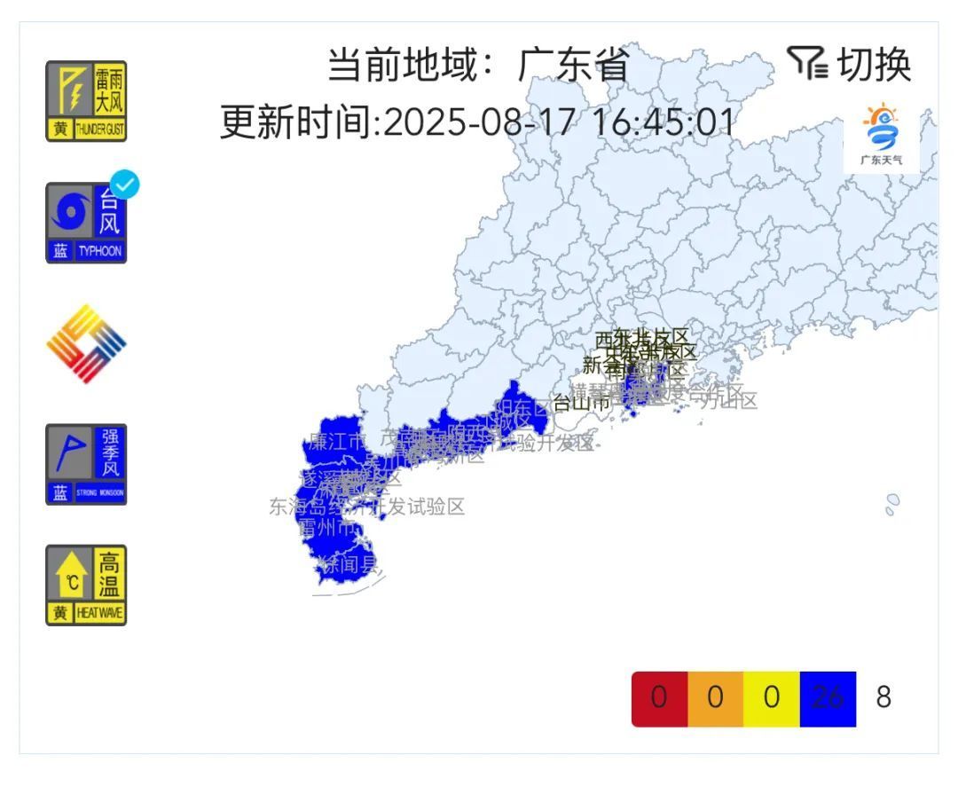 广东西部沿海地区赓续发布台风预警信号。适度17日16时45分,广东共26个台风蓝色预警见效中。