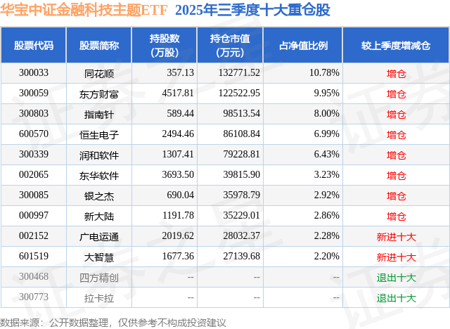从基金范畴来看,华宝中证金融科技主题ETF基金2025年三季度公布的基金范畴为123.19亿元,较上一期范畴57.31亿元变化了65.88亿元,环比变化了114.95%。该基金最新一期钞票成立为:股票占净值比99.52%,无债券类钞票,现款占净值比0.63%。从基金抓仓来看,该基金当季前十大股票仓位达55.64%,第一大重仓股为同花顺(300033),抓仓占比为10.78%。
